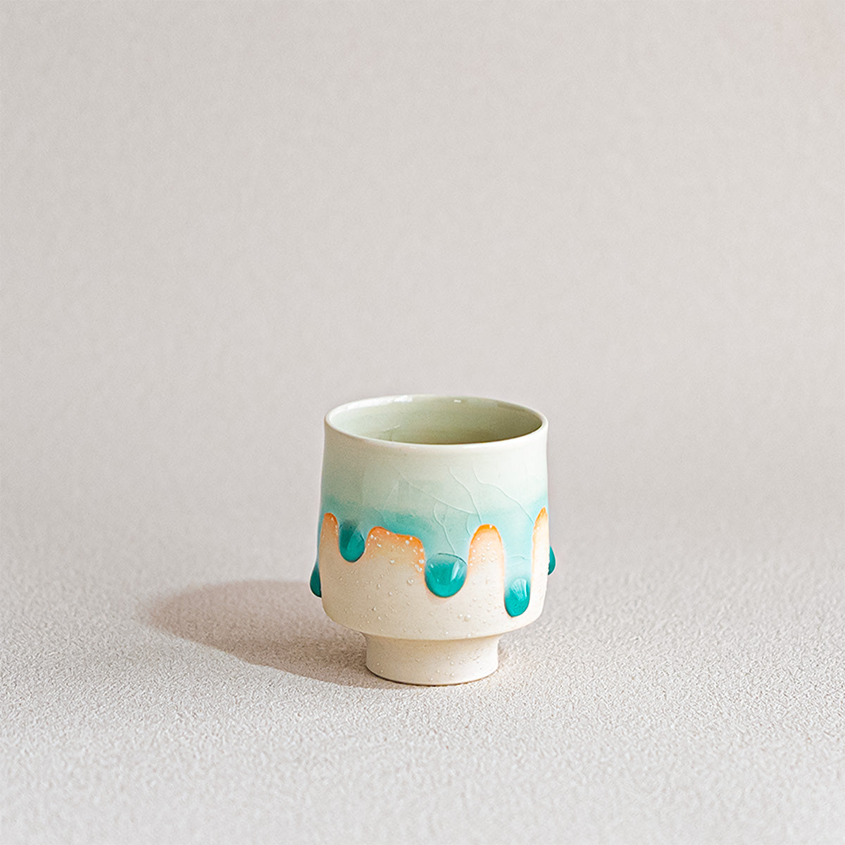 グリーンのグラデーションが美しいぐい吞み。手のひらにすっと馴染むコンパクトなサイズの器です。表面には手作業で描かれた繊細なドット模様が施され、釉薬の自然な流れが作り出す、独特なデザインが魅力的です。グリーンの爽やかな色合いが、食卓に彩りを添えてくれます。